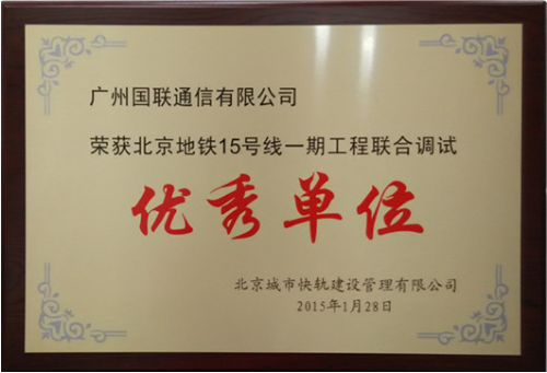 北京地铁15号线一期工程分中段、东段和西段,其中西段自清华东路西口站至关庄站共计8个站点,2014年12月28日开通运行。 我司在北京15号线一期西段工程中承担广播系统新增站点改造项目,改造项目自2014年11月初启动,我司克服项目执行工期短、任务量大、施工时间紧张等困难,在规定时间内,保质保量完成改造任务。 2015年1月30日,北京城市快轨建设管理有限公司召开北京地铁15号线一期工程西段开通表彰大会,授予我司“北京地铁15号线一期工程联合调试优秀单位”的荣誉奖章,以表彰我司在一期西段开通工程中的突出表现。