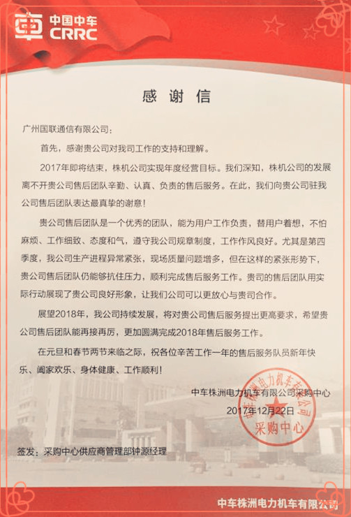 2017年12月底,广州国联喜获中车株洲电力机车有限公司的感谢信,感谢国联售后团队在过去的2017年的努力和付出,对国联售后团队的高效工作给予肯定。 2017,忙碌的一年,我司售后团队克服了时间紧,任务重,项目新等重重困难,夜以继日,加班加点,配合株洲车厂顺利完成了武汉阳逻线,长沙4号线,广8北,广州9号线,广州14&21号线,巴基斯坦拉合尔橙色线,三型动车,五模块等多个项目的调试工作,确保各项目车辆准时下线和各项目准时开通。“当我看到CCTV1播放巴基斯坦拉合尔橙色线首列车下线新闻时,很激动,所有苦和累都值得了,我建设,我骄傲”,这是公司株洲驻厂工程人员朴实的话语。 此外,坚守在全国各地为保障地铁线路正常运行的售后人员,特别是长年驻守在马来西亚,土耳其等异国他乡的小伙子们,虽然是一封简单的感谢信,但它的份量很重,是对每一位售后人员价值的认可。 至诚至专铸品牌,至诚至信造服务,2018年,广州国联通信将继续携手中车株机公司为世界轨道交通建设添砖加瓦。