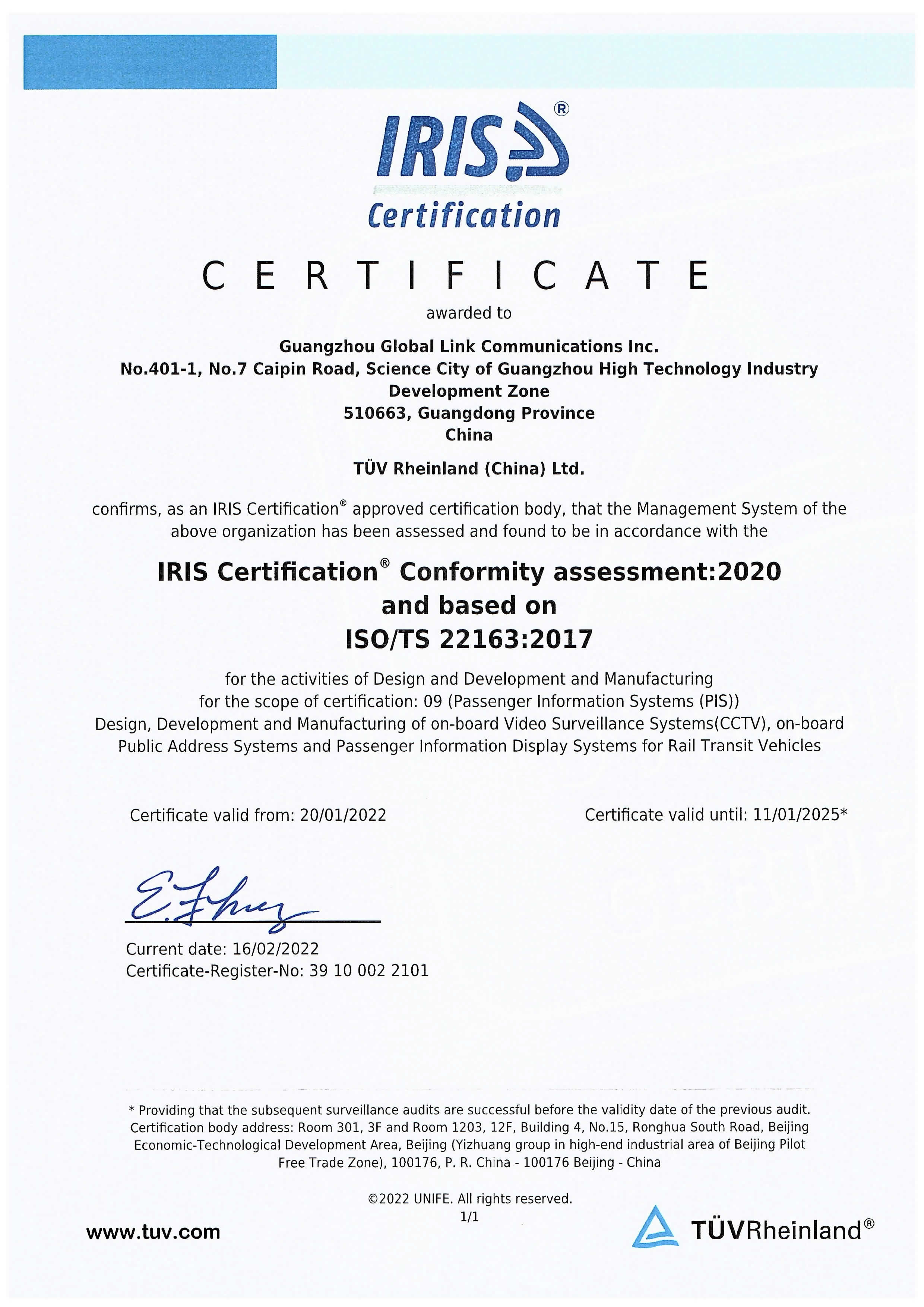 广州国联通信再次顺利通过TUV莱茵国际认证机构IS0/TS 22163:2017(IRIS)认证