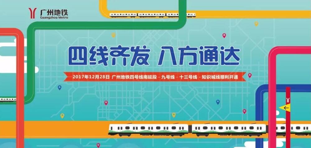 2017年12月28日,广州地铁四号线南延段、九号线一期、十三号线首期和十四号线知识城支线4条地铁新线开通试运营!三号线高增站、四号线庆盛站也于同日同步开通。据了解,这是广州市首次同一天开通四条地铁新线,也是广州地铁继亚运会之后,一年同步开通线路和里程最多的地铁新线。