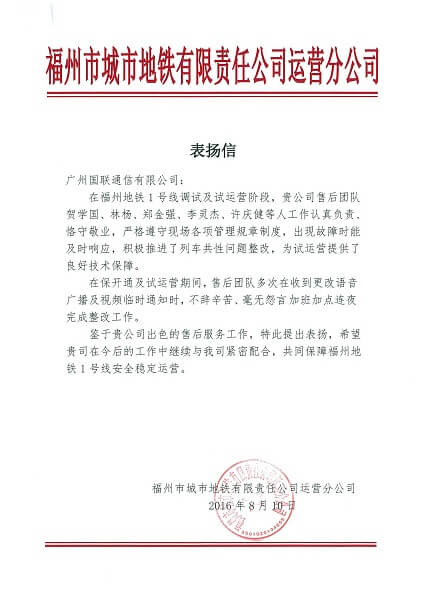 2016810日,福州市城市地鐵有限責任公司運營分公司給我司發來表揚信,表揚我司福州項目及售後團隊在福州地鐵1號線開通及試運營期間的出色售後服務保障工作。